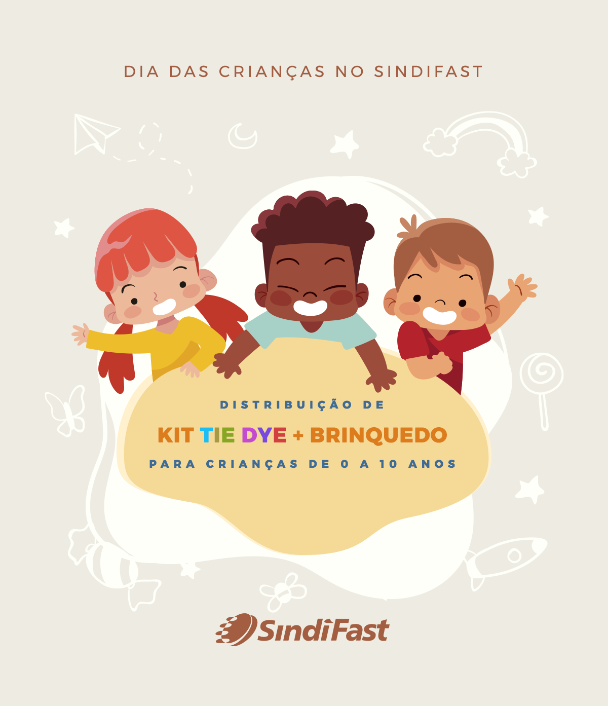 O SindiFast estará realizando no mês de outubro a distribuição de Kits Tie Dye + Brinquedo para os filhos dos nossos sócios, crianças de 0 a 10 anos.